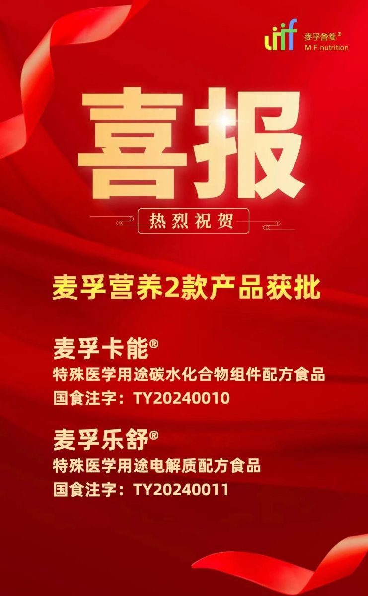 近日,麦孚营养自主研发的两款产品麦孚卡能®特殊医学用途碳水化合物组件配方食品和麦孚乐舒®特殊医学用途电解质配方食品获得国家市场监督管理总局批准,批准文号分别为国食注字TY20240010和国食注字TY20240011。